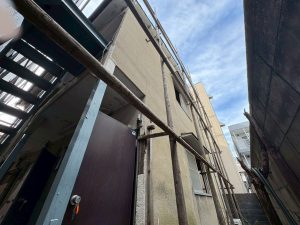 周囲に足場を組み終え、このあと防音シートを張っていきます。