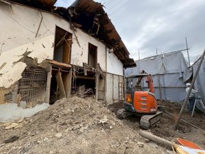 道が狭く、着工からしばらくは軽トラでの廃材搬出…。