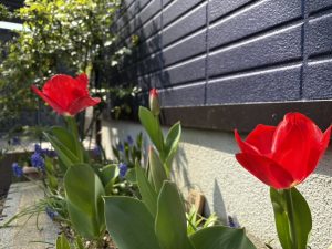 会社の前の花壇にはチューリップが咲いています。