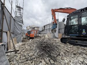 1台の重機でコンクリートガラと鉄筋を分別し、ガラを搬出しながら